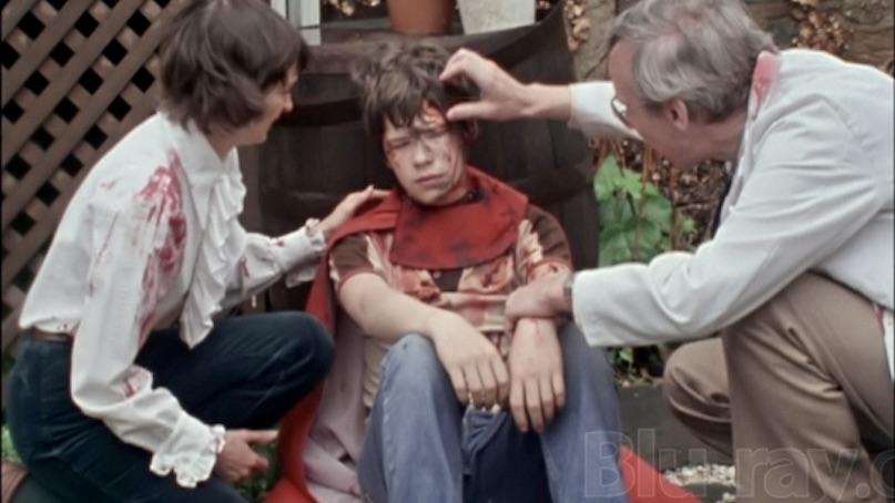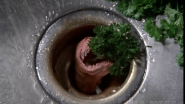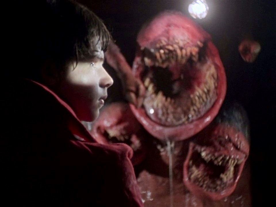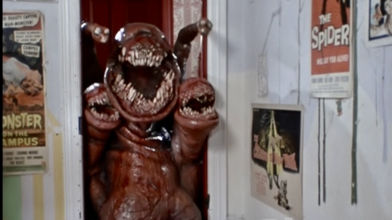 John Dods’ “Spawn” are things of hideous beauty. From giant, razor-teeth, three-headed beasts to tadpole-like creatures slithering in the water in the cellar. They chew through walls, slide up bannisters in the house, or bite through doors, hungry for more prey. There is a fabulous sequence at a nearby house where older female friends get together for a vegetarian feast only to be attacked by scores of these cannibalistic horrors.