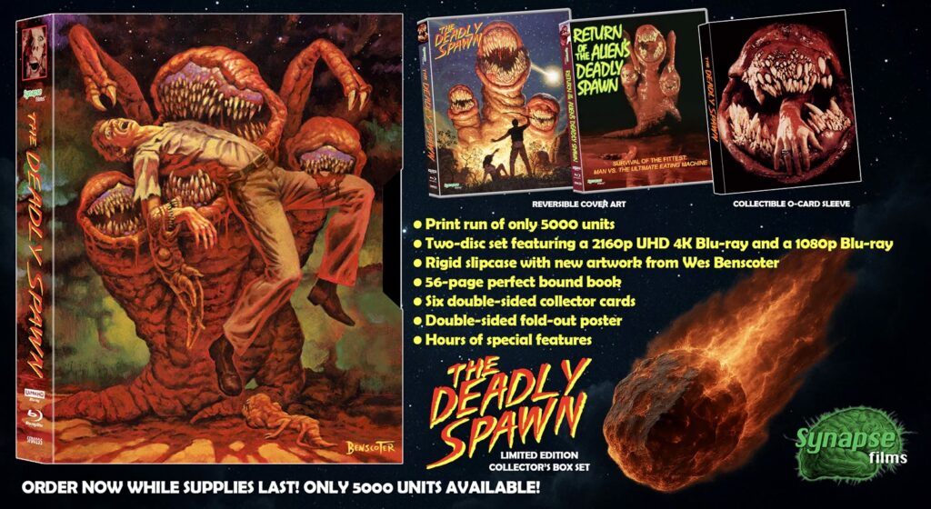 This scrappy, gory 1982 sci-fi cult classic, locally made on a low budget but with phenomenal special effects, is about a meteorite that crashes to earth carrying toothy little alien horrors which take up residence in the watery basement of a suburban home only to multiple and frighteningly grow in size. I so agree with Michael Weldon in his seminal Psychotronic Video Guide, “Watching this movie (made in New Jersey) on 42nd Street was a high point of my Manhattan moviegoing days.” A remarkable 4K UHD Blu-ray limited edition box set has been released by Synapse. A long-awaited treat, a two-disc set filled with extras, audio commentaries, a two-sided poster and six collector cards, plus a colorful booklet of essays and incredible behind-the-scenes photos from the making of this wildly enjoyable chiller.