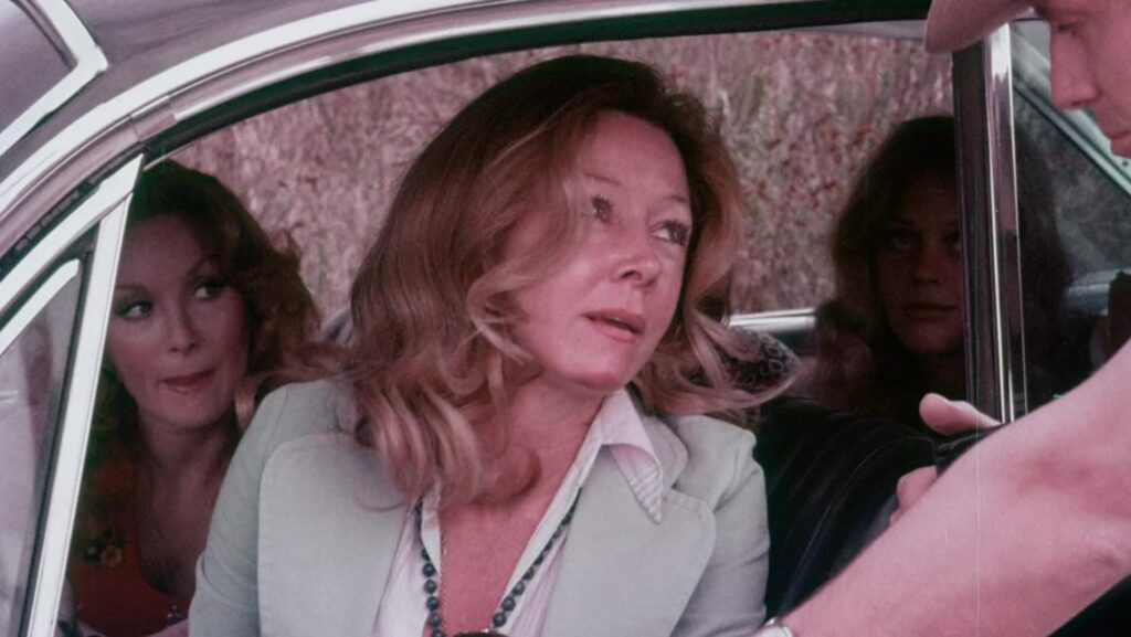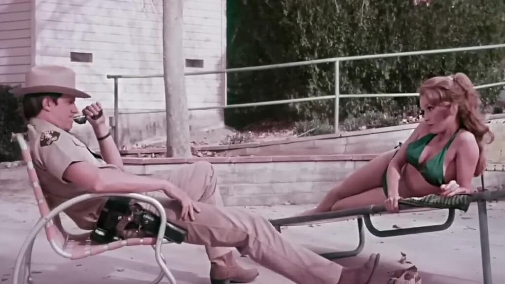 The movie begins with Mama Love (Grahame) bumping off her husband after getting him to sign an admission that he tried to rape one of her girls. She and her dutiful daughters slash his wrists in the bathtub, after getting him drunk, to make it look like suicide. When they find that there’s nothing in the will they head north. “A man is just a man, but property is security!” Mama schools her daughters. They stop at a health spa and Mama takes a shine to the owner Harold (Paul Lambert). He has already drowned his last wife and, thinking Mama is loaded, plots to kill her off while she schemes to get rid of him. Meanwhile her daughters are sleeping with the locals. Becky (Candice Rialson), teasing Willy (Joe Tornatore), the slow-witted caretaker/amateur boxer. Addie (Sondra Currie), sleeping with Roy the cop (Christopher Lofton), whose wife Charity (Anneka Di Lorenzo) won’t give him a divorce. So, Addie decides to fix that problem with a knife she stole from the local handyman Paul (Dennis Smith), who is romancing sister Cindy (Mary Stoddard).