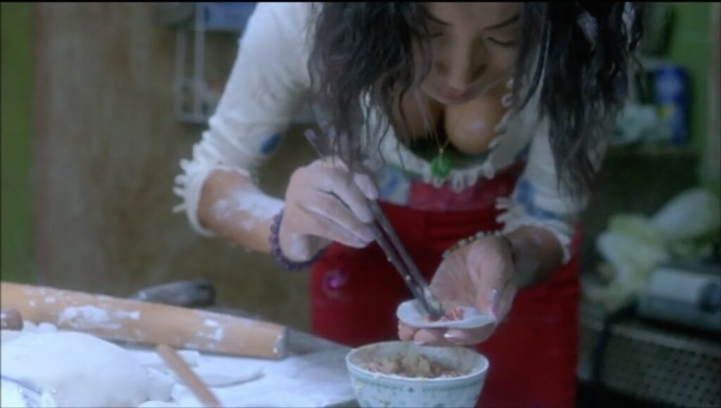 Bai Ling is sensual, offbeat and just terrific in the movie- dressed in tight Capri pants and flowered tops, constantly chewing sunflower seeds and spitting the shells on the floor, or rubbing her flour-coated hands over her curvaceous body while she cooks. Not since the movie Julie & Julia has the preparation of food been filmed with such erotic appreciation. Aunt Mei is supposedly 60-years-old but looks great because she partakes of her own dumplings. As macabre as it sounds, it plays out like a straightforward melodrama. The cinematography is extraordinary, not surprising since it’s by director Wong Kar-Wai’s frequent collaborator- Christopher Doyle.