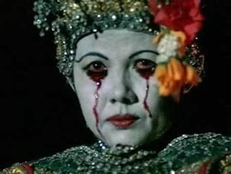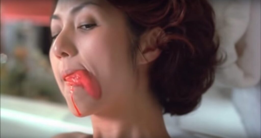 In the shorter version- the wife is abandoned by her husband and there’s some nasty business with her in a tub at the end where she licks her lips with a supernaturally long tongue darting from her mouth. In the feature film- she extracts revenge on her husband by purchasing the unborn baby sired by his mistress. She raises a cleaver to it at the end with a victorious and malicious smile.