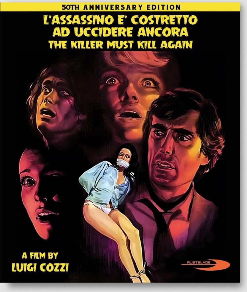 The Killer Must Kill Again (Rustblade) 50th Anniversary Edition, which comes with a booklet and three postcards and two discs- Blu-ray and DVD of this terrific 1975 “giallo” by Luigi Cozzi (the first feature he directed after collaborating with Dario Argento on Four Flies on Grey Velvet and other projects). Giorgio (handsome George Hilton) is a philandering husband who catches a man (Antoine Saint-John) pushing a Volkswagen off a pier with a dead victim inside. Giorgio blackmails the psychopath into disposing of his own wealthy wife. The plan goes awry when two young lovers steal the killer’s car and drive to the beach, unaware that Giorgio’s wife’s corpse is in the trunk. The “killer” has the most incredible face- with sunken cheeks and deep-set, skull-like eyes- in this deliciously nasty thriller by Luigi Cozzi.